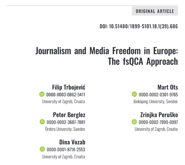 Filip Trbojević, Peter Berglez, Dina Vozab, Mart Ots & Zrinjka Peruško (2025). Quality of Journalism and Media Freedom in Europe: The fsQCA Approach. Central European Journal of Communication, 18(1(39)), 29–50. https://doi.org/10.51480/1899-5101.18.1(39).686 |