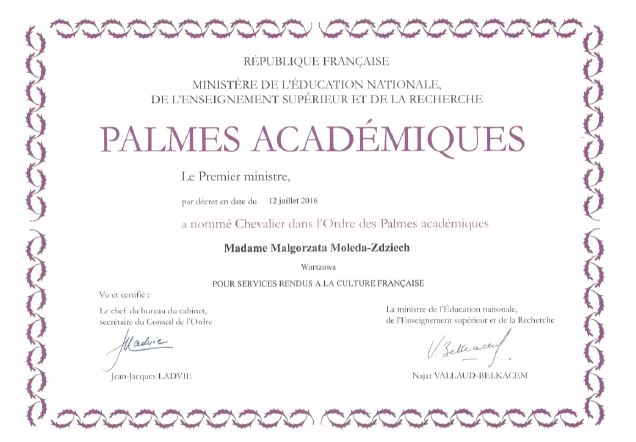 Order został przyznany dekretem premiera Francji z 12 lipca 2016 roku ?za zasługi dla kultury francuskiej?, w tym ?wzmacnianie więzów uniwersyteckich pomiędzy Francją i Polską?.